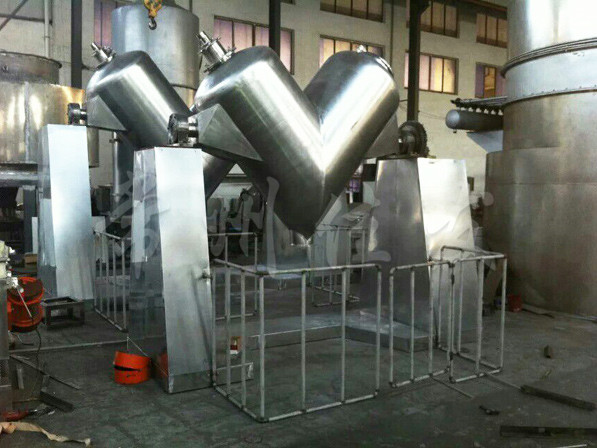該機通過機械傳動,使不對稱的V型圓柱體內(nèi)的物料做往復翻動,達到均勻混合之目的。