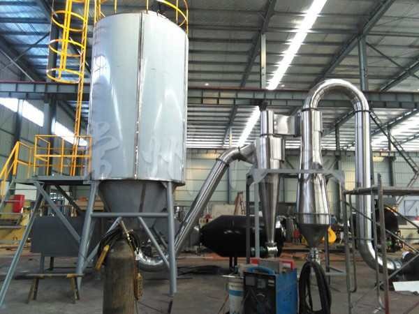本機是將料液壓入壓力噴嘴霧化成微小霧滴,在塔內(nèi)與熱風(fēng)以對流的方式完成干燥,獲得顆粒產(chǎn)品。